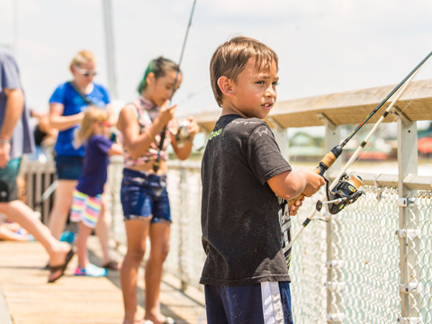 The Island Pier offers rod and reel rentals, bait and wristband access for the full day, allowing families to take breaks for snacks or lunch before returning to the water.