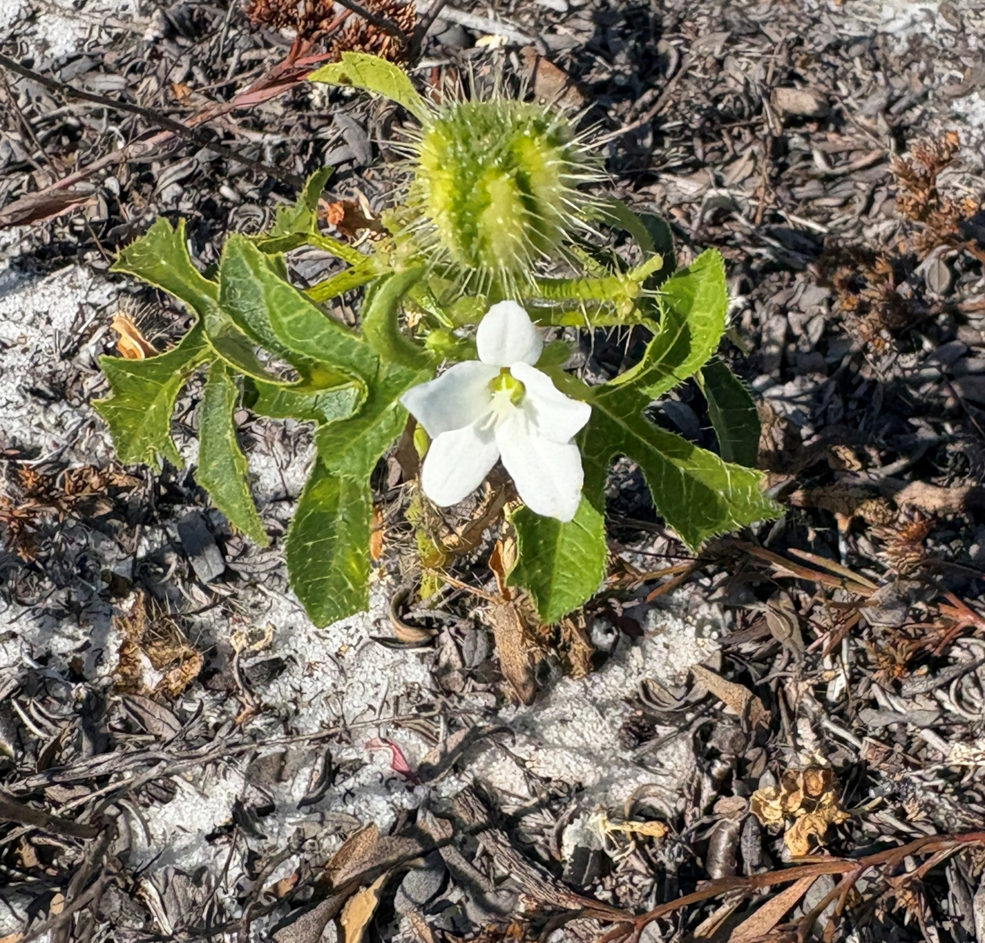 Also known as tread-softly and finger rot, this herbaceous perennial plant produces white trumpet-shaped flowers that are also covered in small stinging hairs. The stinging hairs cover the stem, leaves, and seeds of this plant. If the hairs are touched a stinging sensation will cause irritation and can even cause rashes in some people. Spurge nettle is not a true nettle despite the plants stinging capabilities. This plant prefers well-drained, sandy soil with light shade and is known to bloom year-round. It naturally occurs in sandhills, scrubs, pine, and flatwoods habitats. It attracts butterflies and other pollinators. This is even a treat of the elusive beach mouse. Despite the stinging characteristics of this plant, beach mice will break open the seed pods on this flower to consume, and this helps disperse the seeds throughout the ecosystem.