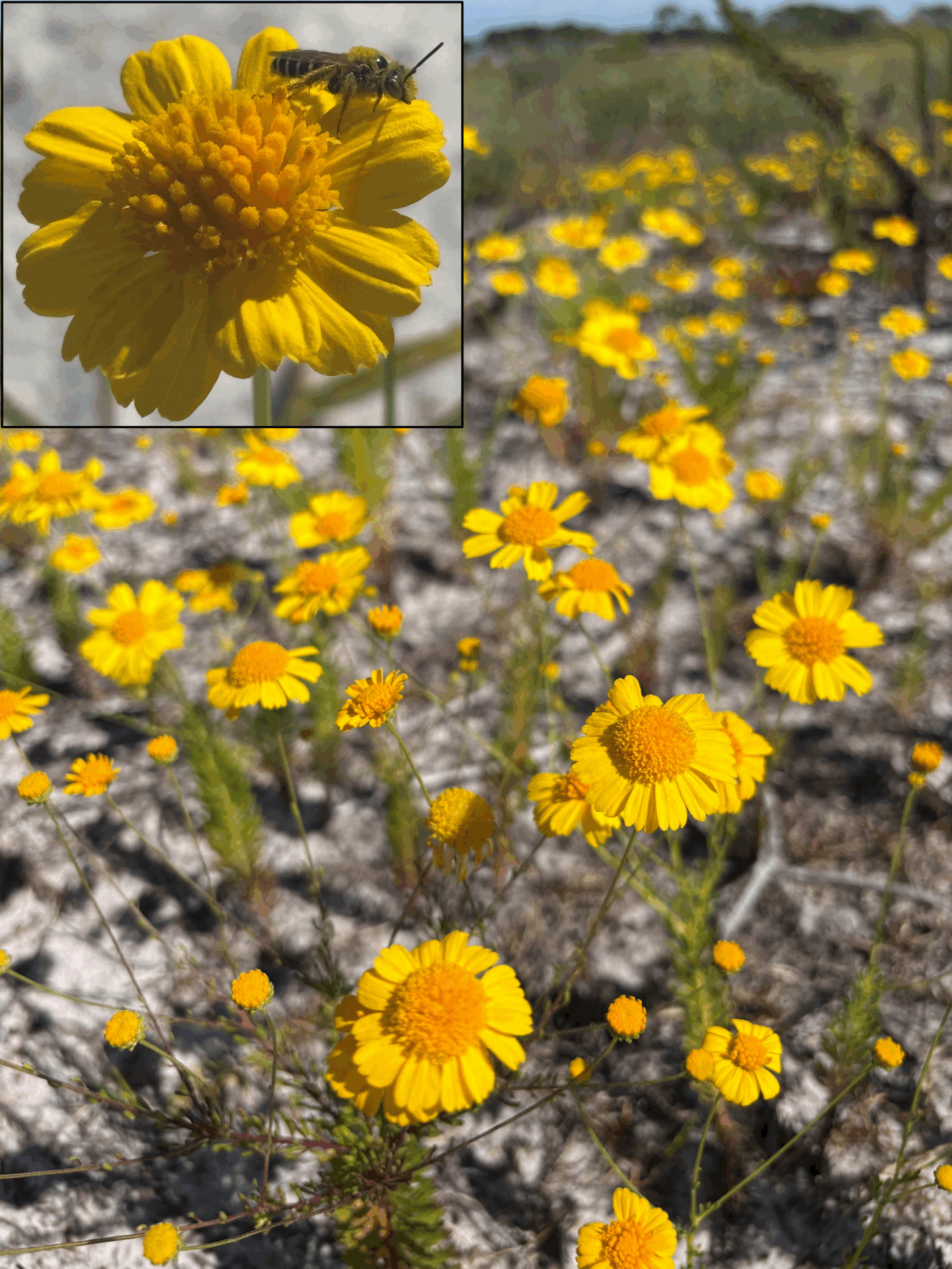 Also known as yellow buttons, this annual to biennial wildflower consists of many yellow ray and disk florets. This flower will produce 20 or more flowerheads on each plant. As the plant matures and reaches a post-anthesis stage (pollen is no longer in production) this flower resembles a honeycomb which led to its common name. Coastalplain honeycombhead can grow up to 3 feet tall in dunes, sandhills, and scrubby flatwoods. This wildflower has a mutualistic relationship with the Gulf Coast Solitary Bee and is seen blooming summer into fall.