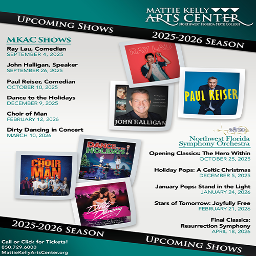 VISIT WEBSITEWelcome to Mattie Kelly Arts Center, located along the beautiful Emerald Coast in Northwest Florida. For more than 25 years, MKAC has been providing world-class productions to patrons in the Southeastern United States. In addition to hosting Broadway shows, the Arts Center is also home to the Northwest Florida State College Department of Humanities, Fine & Performing Arts, and hosts a myriad of student-run shows. The Arts Center boasts a variety of theaters, galleries, and even an outdoor amphitheater that makes it an ideal venue for any style of performance.